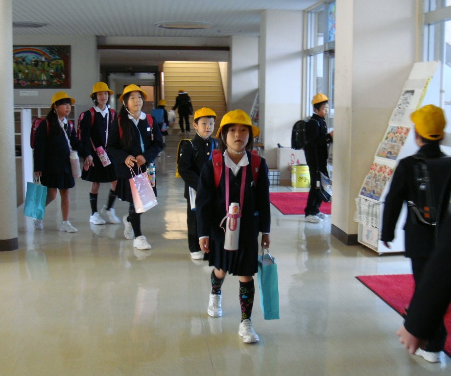 火災を想定した避難訓練をしました。今回は、予告なしで休み時間に非常ベルを鳴らしました。児童は、その場で動きを止め放送を最後まで聞き落ち着いて避難できました。1月に大阪の小学校で、休み時間に理科準備室から出火した事故があった直後だったため、新聞記事を見せ、火事はいつ、どんな時に起こるか予想できないことや日ごろからの訓練の大切さを話しました。