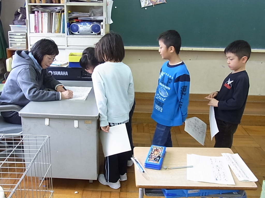 1年生から、自分の辞書がいつも机に入れてあります。昨日は、2年生が「スーホの白い馬」の勉強で、難しい言葉の意味を調べていました。辞書は、いつも引くことを繰り返すと、探す時間が速くなります。自然と50音の順番も覚えます。どの学年も、MY辞書が黒く汚れる位繰り返し使ってほしいです。