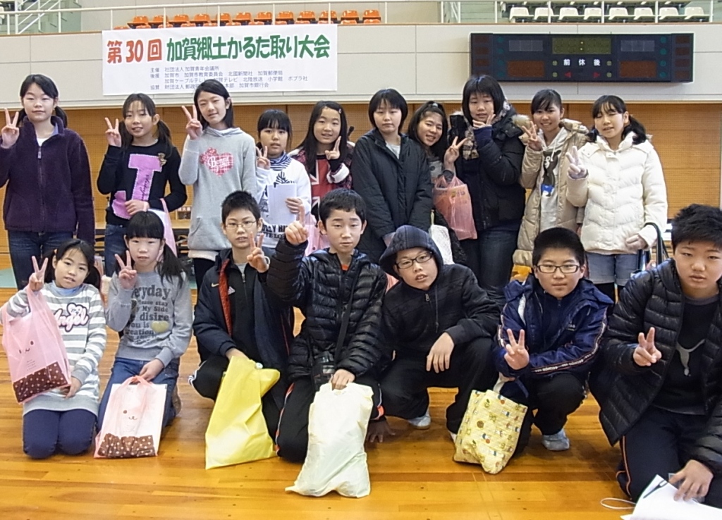 25日(土)にスポーツセンターで郷土かるた取り大会がありました。本校からは7チーム出場し、どのチームも健闘しました。他の出場校の小学生と、会話したりして交流と親睦を深めることもできました。