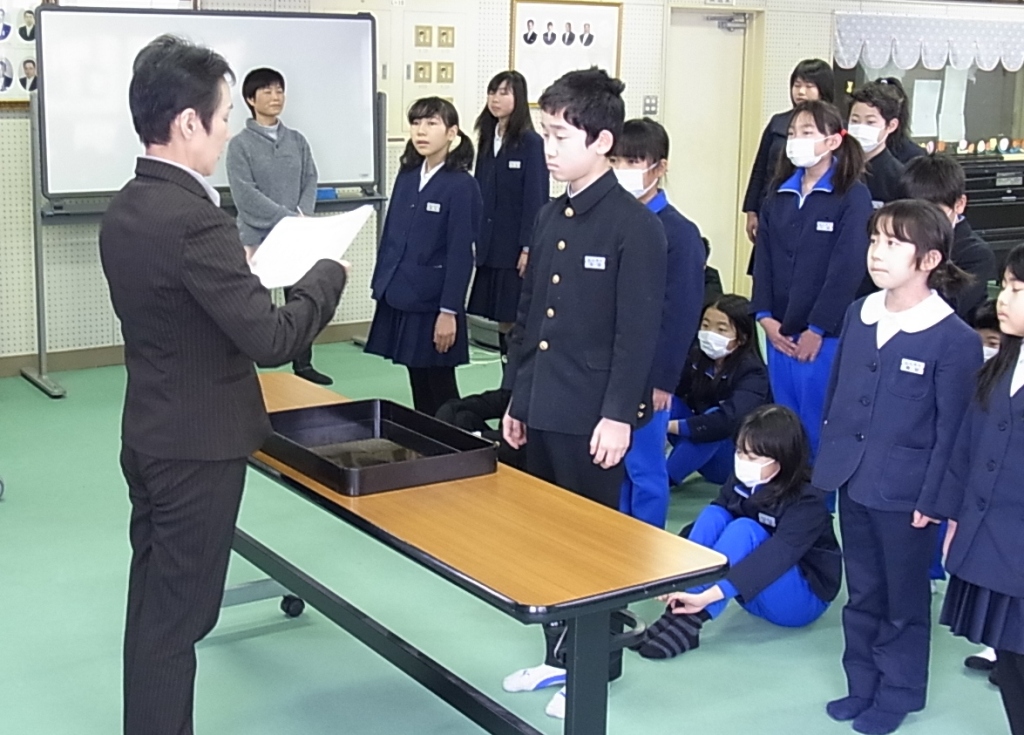担任から、一人ひとりの通知表を見せてもらい、全員が良く頑張ったことを嬉しく思うことや、読書ノートで400冊以上読んだベスト3の子の紹介や、校報「三木の子」を1年間配達してくれた子への感謝等を伝えました。