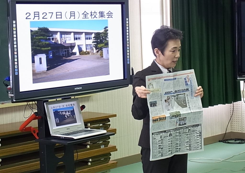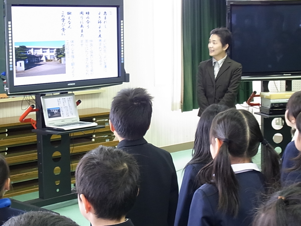 三木小学校には、三木校讃歌と校歌の2つがあります。電子黒板を使い、2つの歌が作られた経緯や歴史を話しました。そして、校歌の歌詞の意味についても説明しました。3題目まで、歌詞に込められた意味を確かめながら、大きな声で校歌を歌って集会は終わりました。