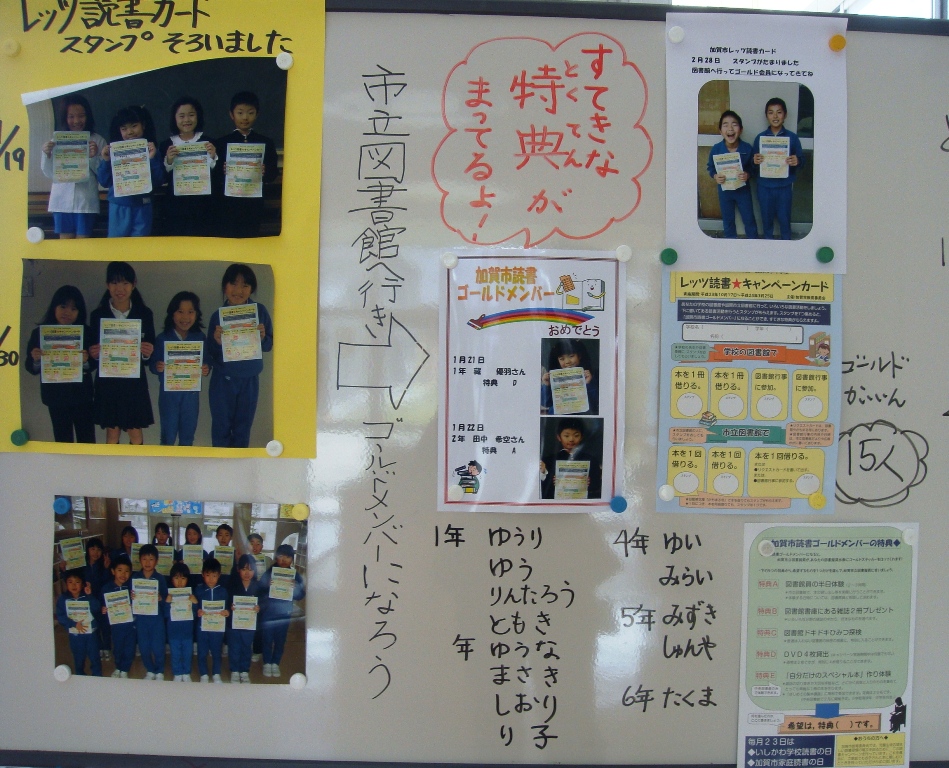 「校長先生おはようございます」の挨拶と共に「図書館へ行ってゴールドメンバーになって来ました」という報告を次々としてくれました。5つの特典のうち一番人気は「図書館ドキドキひみつ探検」です。