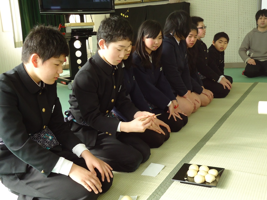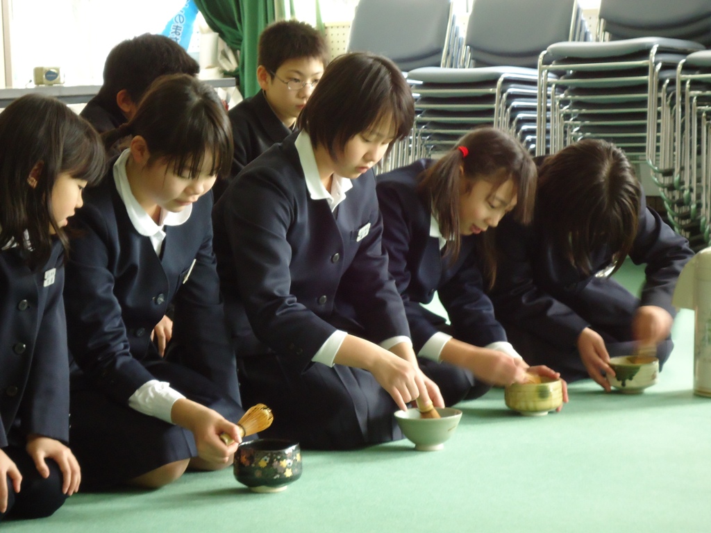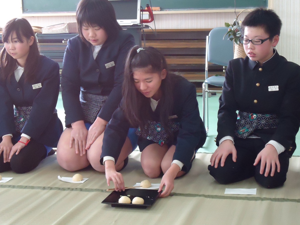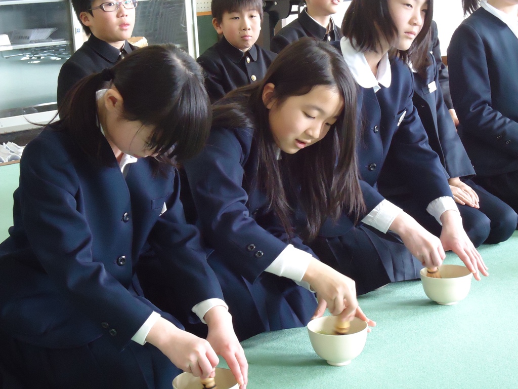 4.5年生は総合で伝統文化体験として茶道を学習しています。最後の茶道教室に卒業する6年生を招きました。6年生は去年の経験をいかし、嬉しそうにお菓子やお茶を頂いていました。茶道体験はとても心を豊かにしてくれます。