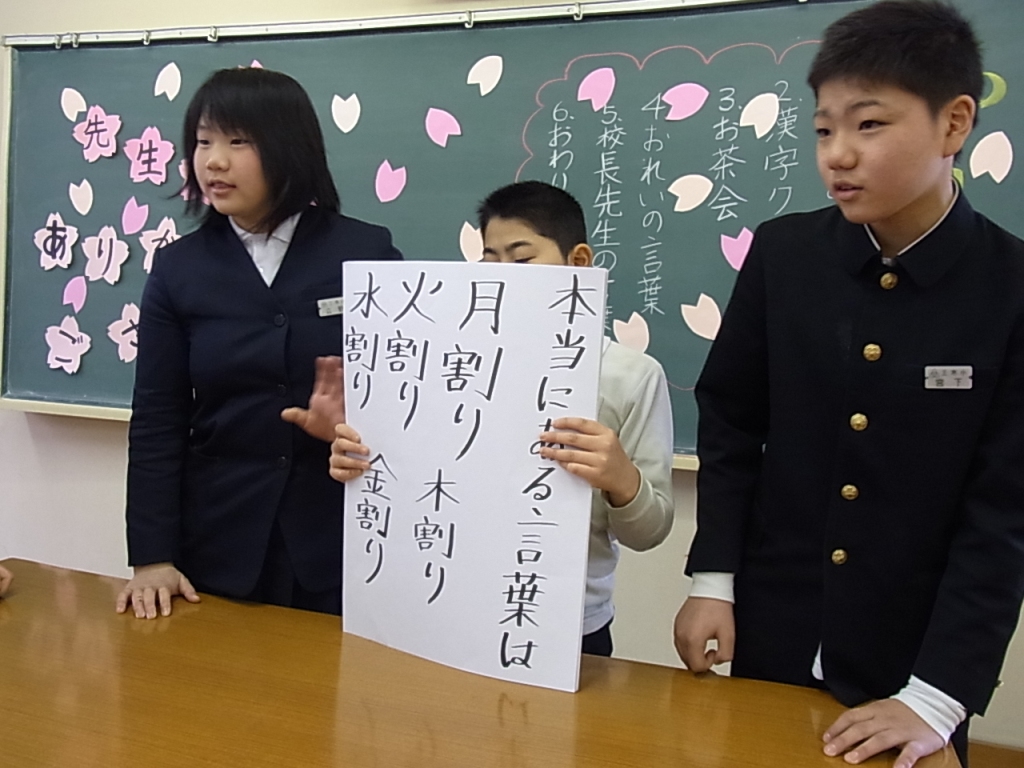 6年生が「先生方ありがとうの会」を開き、校務員さんや調理員さんも交え招待してくれましら。クイズやお茶会、お礼の手紙など、相手を喜ばせようとする心がとても伝わるおもてなしでした。自分たちで企画運営し、楽しい会になりました。ありがとう