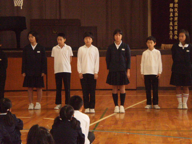 卒業した6年生も来てくれました。離任される先生方からは、呼びかけの言葉や、歌や一人一人の言葉を頂きました。児童の代表が、手紙とお花を手渡しました。これまでの思い出や、お世話になった事などを伝えました。しんみりと涙ぐむ子もいましたが、最後は校歌を歌いアーチを作って送り出しました。
