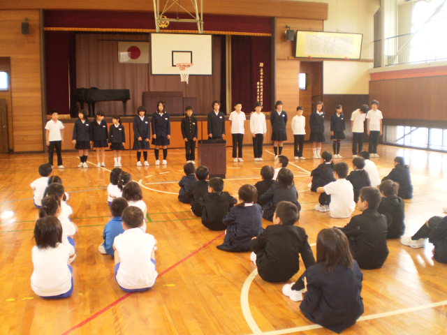 最後に校歌を歌いました。1年生はまだ全部歌えませんが、必死に真似をして歌っていました。次の集会では、きっと1年生も元気に校歌を歌ってくれることでしょう。