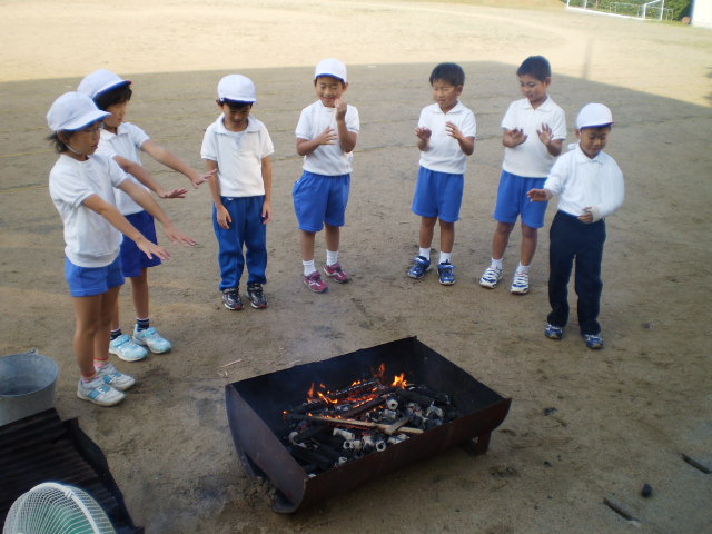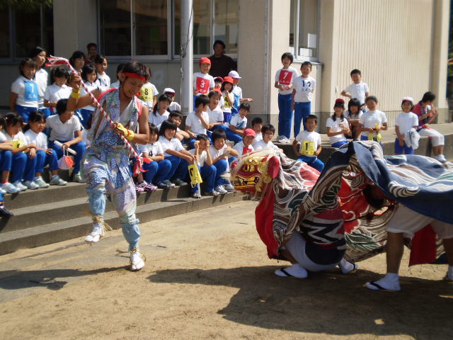 今日、昼休みにリレーの練習をしていたら、三木町の獅子舞がやって来ました。青年団の激しい帽振りの踊りに、子ども達は目が釘付けになって観ていました。秋晴れのすがすがしい日でした。稲刈りが終わるこの時期に、秋祭りがこうして代々引き継がれているのでしょうね。「僕の町も、大人から僕らまで獅子舞の練習しているんや。」と言っている6年生もいました。きっとこの子達も、次の青年団を担う若者となることでしょう。