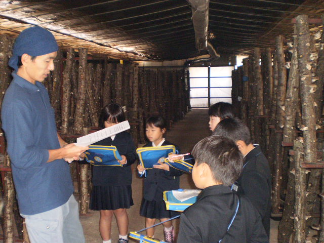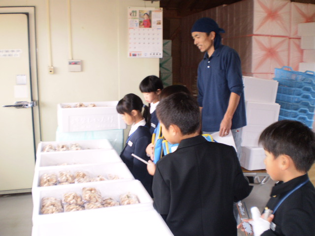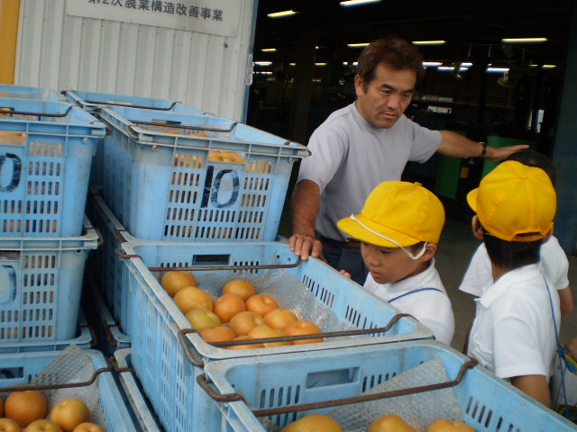 3年生が、社会の勉強で、三木地区奥谷町にある梨の選果場へ見学に行って来ました。「なし農家のひみつをさぐろう」と、事前に自分たちが質問したいことを考えて、一人ひとりが聞きました。案内してくださったのは、奥村さんです。おかげで、いろいろなことが分かりました。