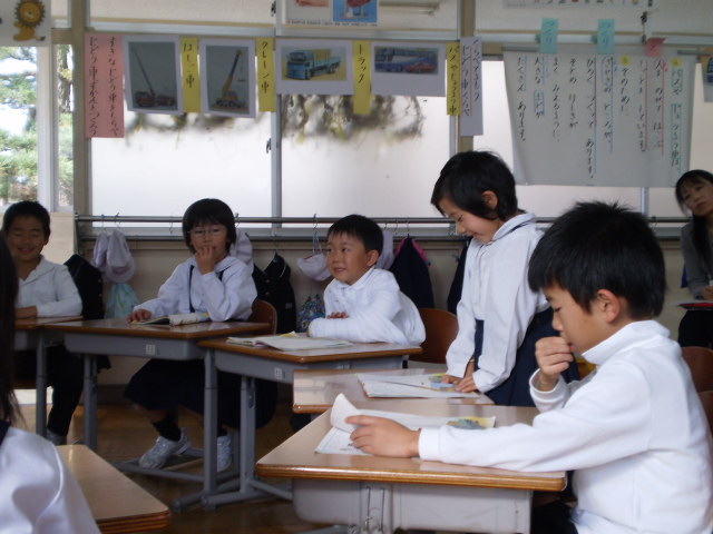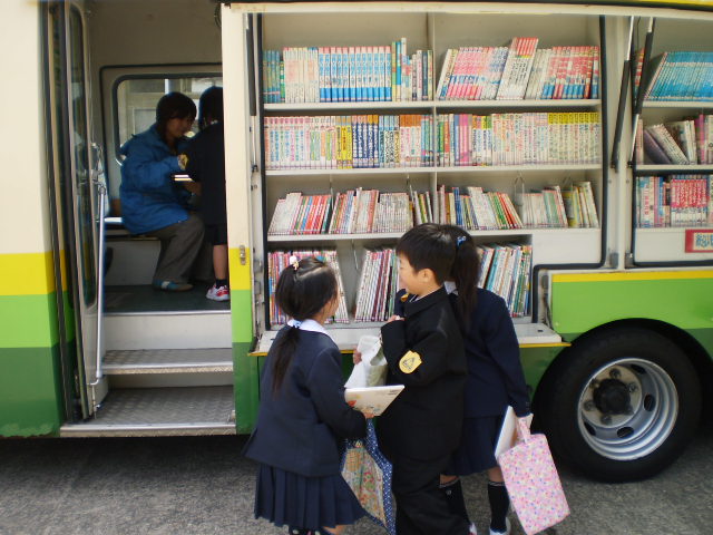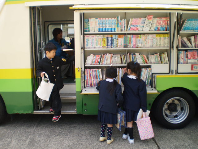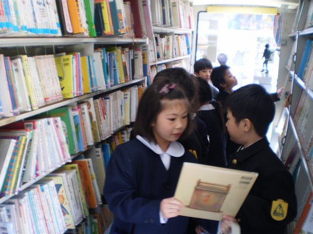 子どもたちは、昼休みに、絵本バッグを手に持って、嬉しそうにバスに乗り込み本を選んでいます。1年生も、昨日は、9人全員が、自分で好きな本を選んで、借りていました。
