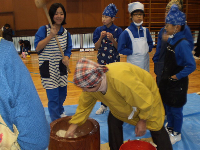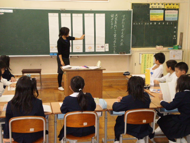 4年生は、今、社会で「古い道具と昔の暮らし」という学習をしています。学校には、わらで作った「もっこ」や、石臼など、昔の道具がいろいろ保管してあります。昨日は、竹本館長さんを招いて、それぞれの道具が何に使われたのかお話して頂きました。石臼で、実際に大豆を引きました。香ばしい黄粉の香りがしてくると「おいしそう。」と言いながら、石臼を回していました。