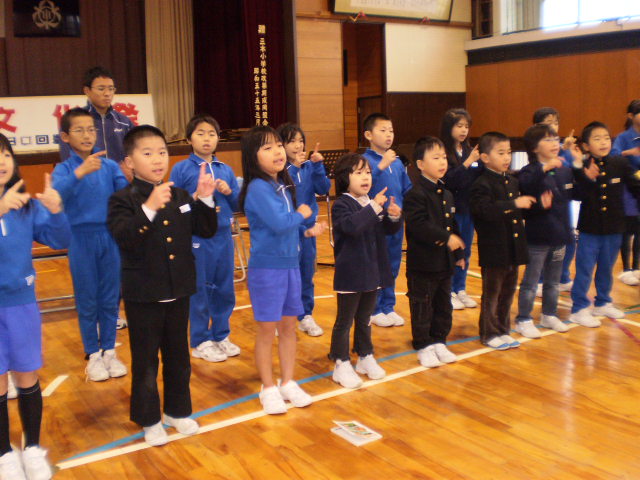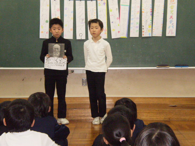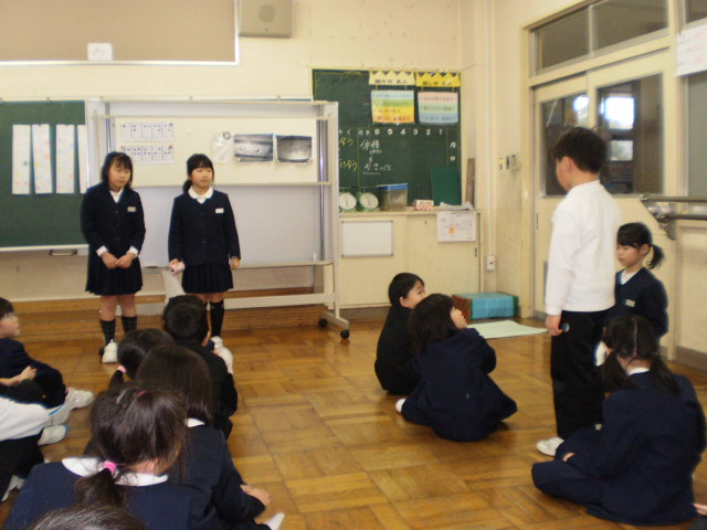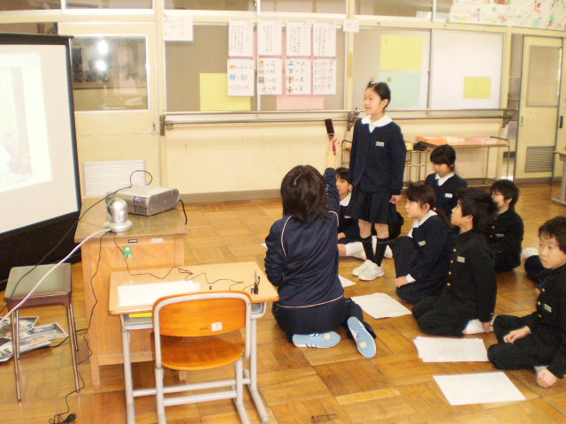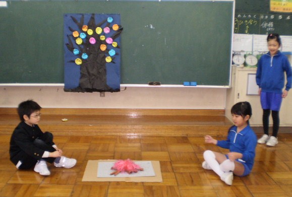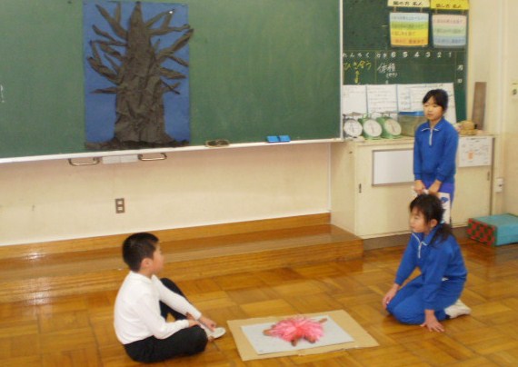 3年生が国語の「モチモチの木」の音読を1・2年生と級外の先生に発表してくれました。ナレーター、じさま、豆太の役を交代しながら、表現豊かに音読し、見ていた低学年から素敵な感想をたくさんもらい、嬉しそうでした。3年生は、自信につながりました。