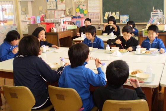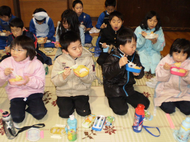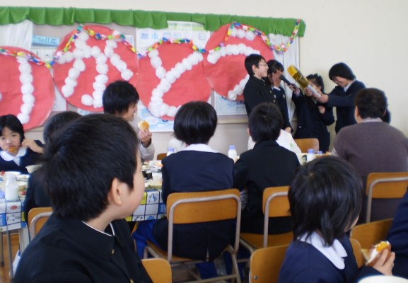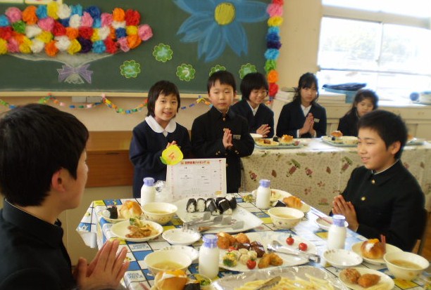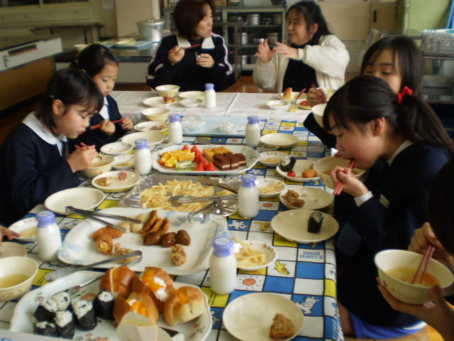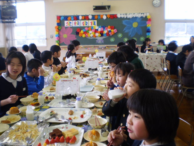 卒業を間近にし、今日は全校50名と教職員14名が、一同に会し「バイキング給食」をしました。テーブルごとに大皿に盛られたメニューから、皿にとるいつもと違った雰囲気の中で、他学年が交流しあい、仲良く触れ合いました。6年生にとっては、最後の良い思い出になったことでしょう。