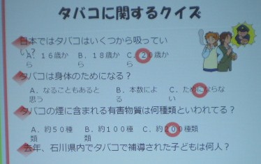 大聖寺警察署の方が来られて、今回は「たばこ」についてクイズをしながら、勉強しました。