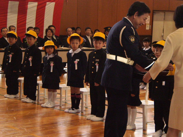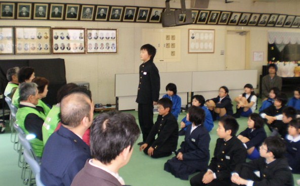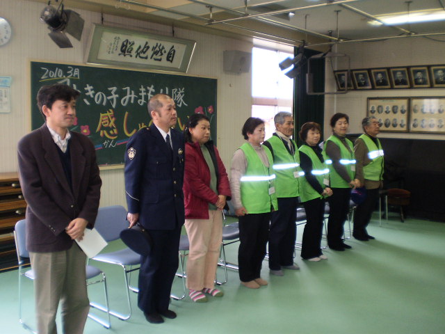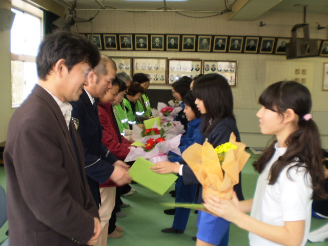 会には、見守り隊の他に、スクールガードリーダーの方と、駐在所のお巡りさんにも参加して頂きました。児童一人一人が感謝の気持ちを込めたメッセージを添えて、小さな花鉢をプレゼントしました。