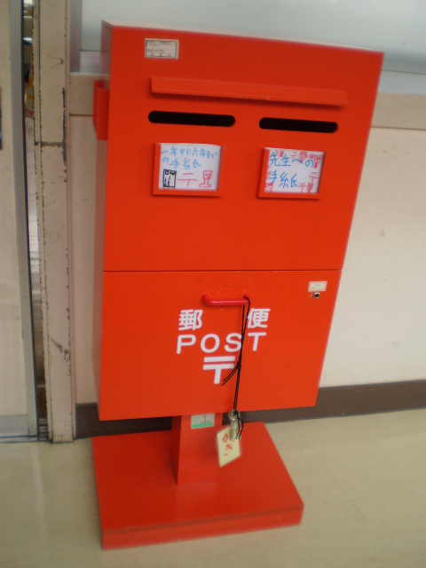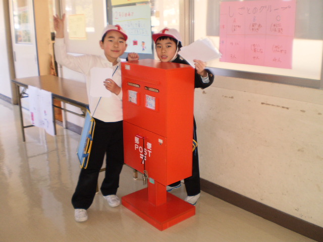 1.2年生が生活科の学習で2月23日~3月9日の2週間「ハッピー郵便局」を開いています。めあては「みんながはがきを書いて仲良くなろう」「みんなで協力して楽しく郵便の仕事をする」です。学校には、本物そっくりのポストがあります。1.2年生は、昼休みにはがきにスタンプを押して配達したり、はがきを販売したりしてはりきって仕事をしています。教職員も児童も、はがきをもらうととてもハッピーな気持ちになります。