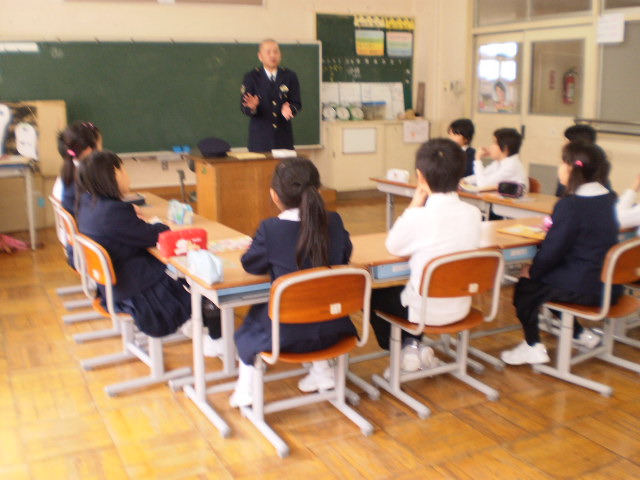 3年生が社会で、「ひとびとのしごとと私たちのくらし」の勉強をしています。そこで、駐在所のお巡りさんをゲストティーチャーに招き、警察の人はどんな仕事をしているのか勉強しました。お話を聞いたりビデオを見て私たちが安全に生活できるように、パトカーで巡視したり事故や事件の処理をしたりといろいろな仕事をしていることが分かりました。