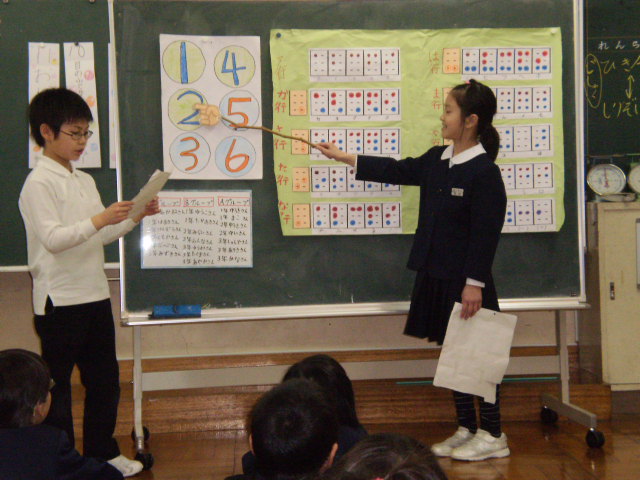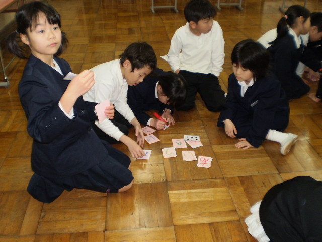 3年生が総合的な学習で目の不自由な人たちの学習をしました。中でも、「点字」についていろいろ調べたことを、1・2年生に発表しました。点字を使う人、点字が使われている物、点字の仕組みなど大変上手に発表していました。1.2年生にもよくわかりました。最後にカードにひらがなと点字をペアで書いて、トランプの神経衰弱のようにしてゲームもしました。異学年がこうして交流することはとても良いことだと思います。