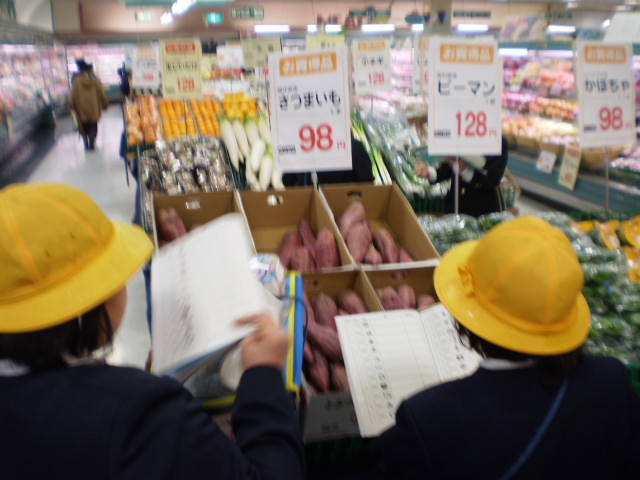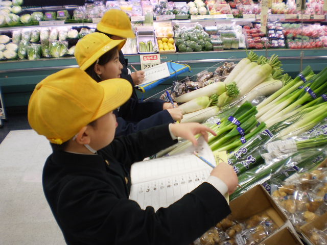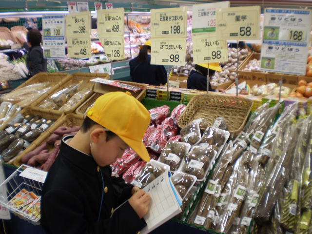 大聖寺のスーパーへ行って、5年生が野菜の産地調べをしてきました。