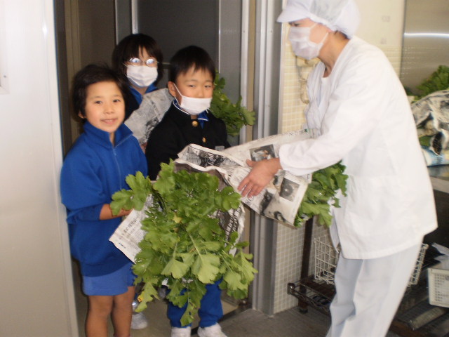 昨日1年生が畑から掘った大根が、給食に出されました。まるでカブのような柔らかさでした。やはり掘りたては違います。薄味ですが、しっかりと中まで味がしみ込んでいました。早速1年教室まで行って、「おいしかったよ。ほっぺたが落ちそうだったよ。こんなおいしい大根、食べたことないわ。」とお礼を言うと、「ありがとうございます。」とにこにこ顔で次々に答えてくれました。