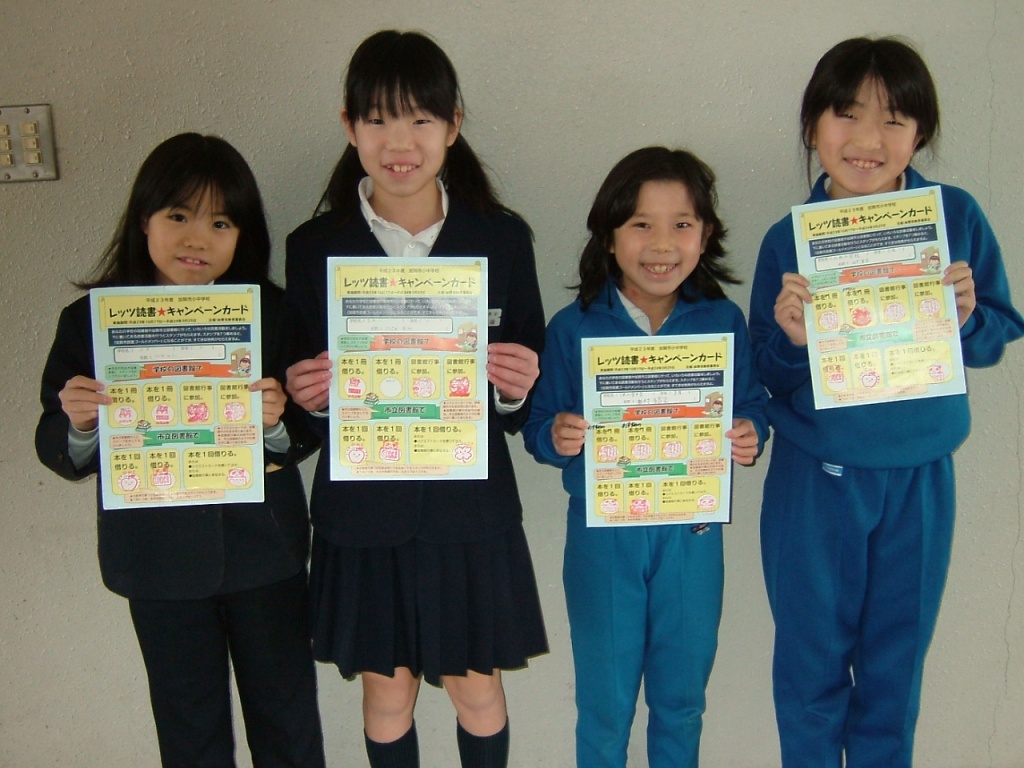 4人の子が、レッツ読書キャンペーンカードにスタンプがすべて押されました。