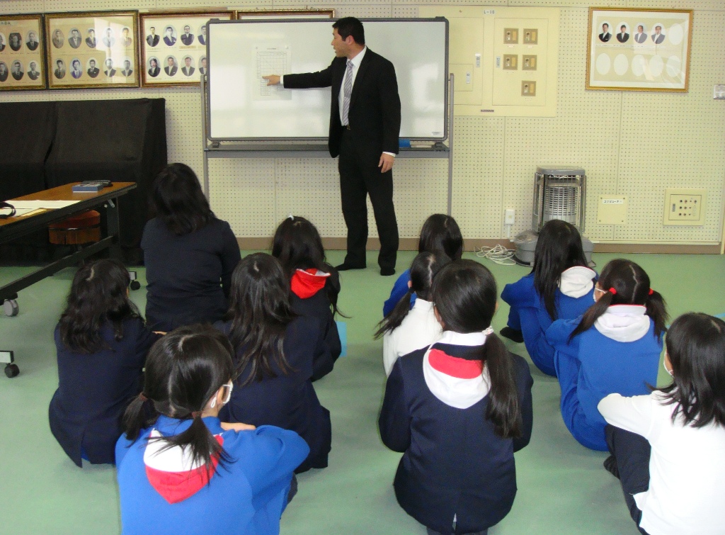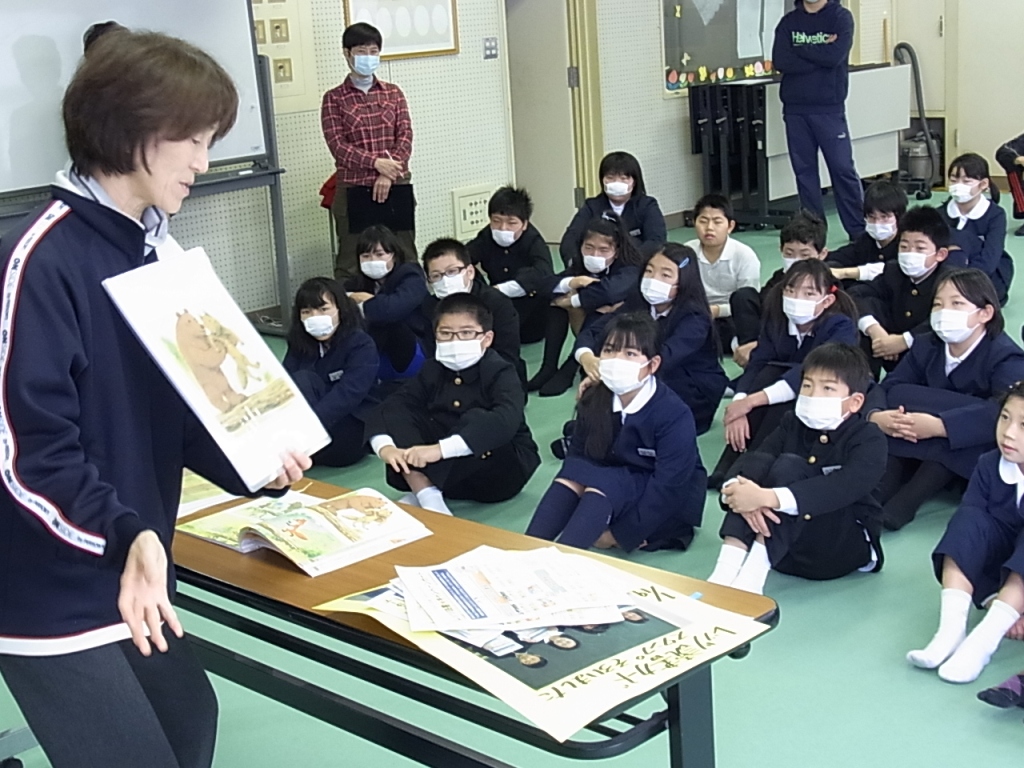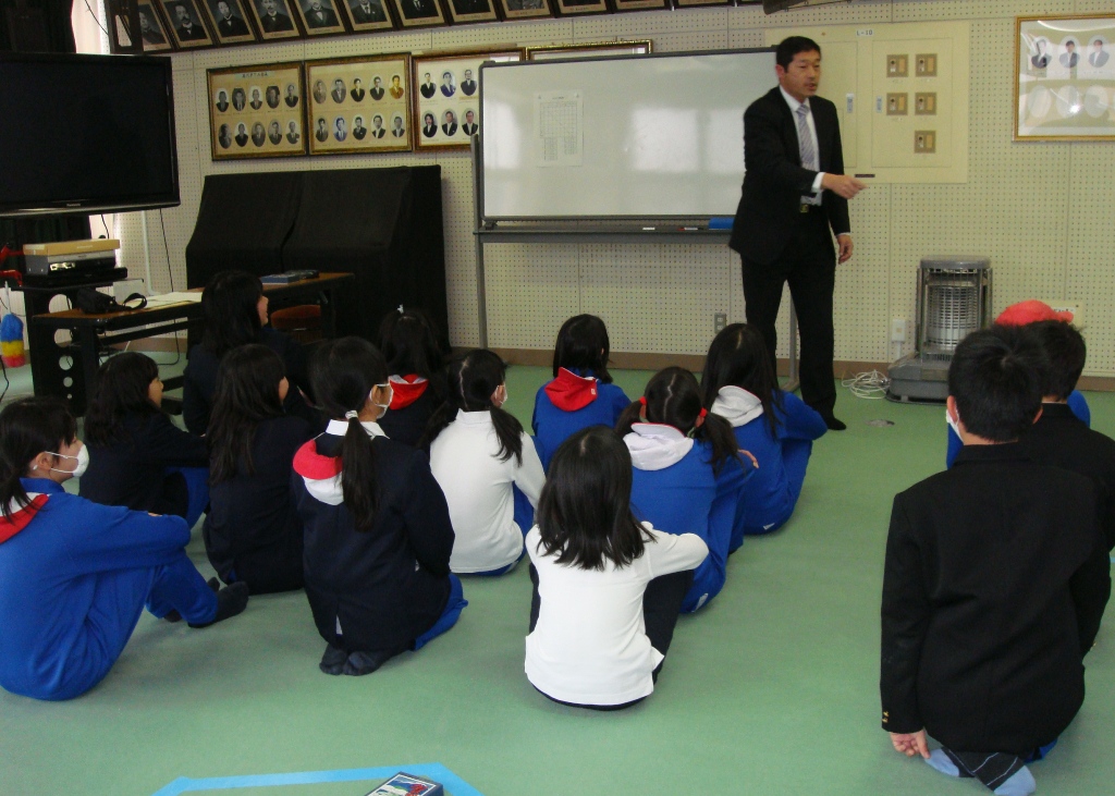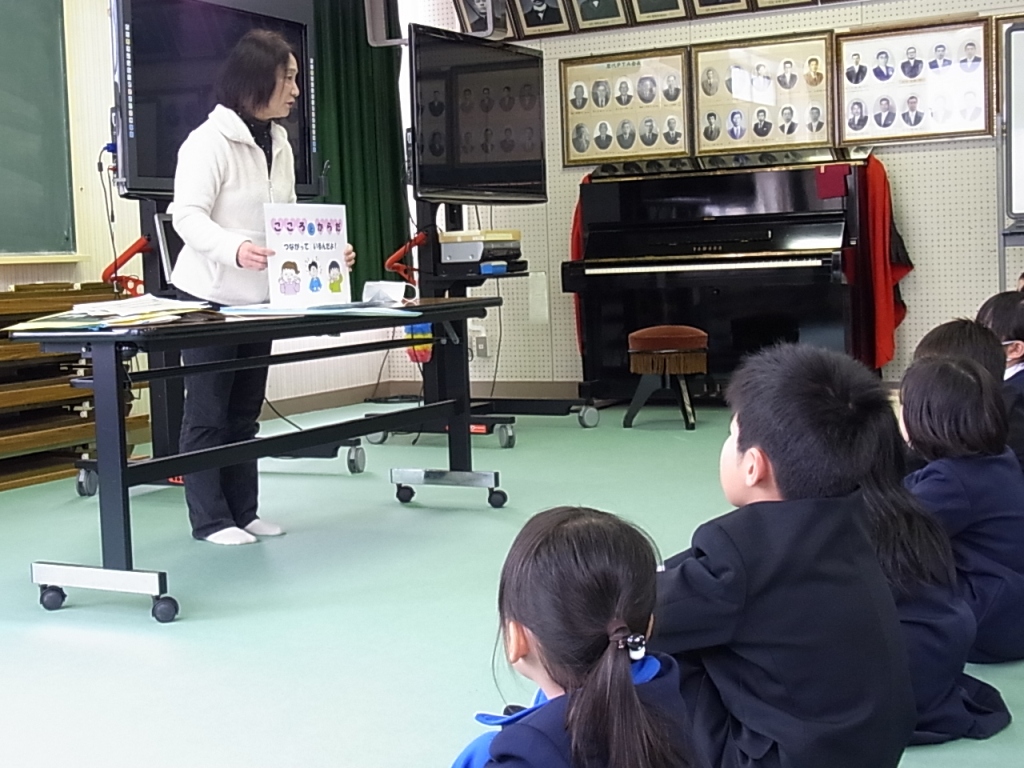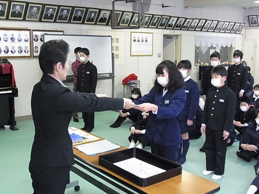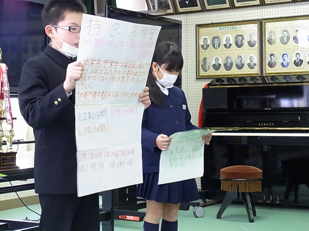 まず、書き初め大会の表彰式をしました。冬休みの練習成果が出て、優秀な賞をとる子がたくさんいました。よく頑張りました。