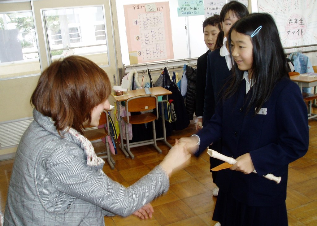 ミリ先生との英語活動が昨日で、今年度最終回でした。そこで、授業の終わりに、簡単な感謝の会をしました。音楽で練習したリコーダー演奏をしたり、一人ずつ英語で感謝の言葉をいいながら、握手しました。ミリ先生は、4月からまた、英語活動のALTとして三木小学校に来て下さいます。それまでしばらくのお別れです。