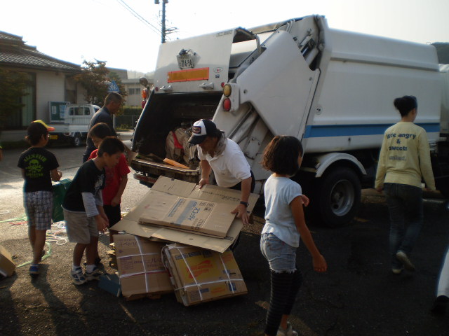 段ボールは、トラックの中へ アルミ缶のプルタブは、取って貯めよう