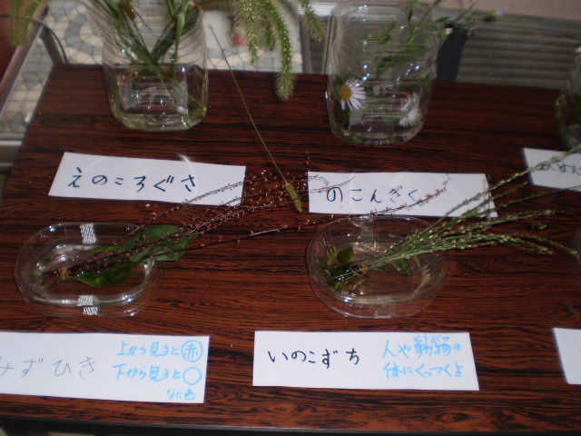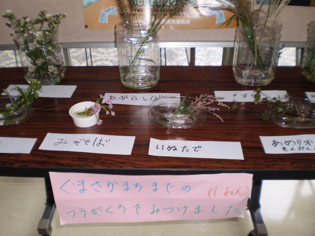 熊坂町の通学路に、ドングリがたくさん落ちていると聞いて、1年生が拾いに行きました。生活科の「秋見つけ」として、道端で草花もつんできました。学校に帰ってから、図鑑で名前を調べました。玄関前に、名前カードを付けて展示しました。学校からちょっと出かけて、秋の草花が見つけられる環境にあることを幸せに思います。