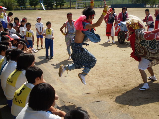 今日、昼休みにリレーの練習をしていたら、三木町の獅子舞がやって来ました。青年団の激しい帽振りの踊りに、子ども達は目が釘付けになって観ていました。秋晴れのすがすがしい日でした。稲刈りが終わるこの時期に、秋祭りがこうして代々引き継がれているのでしょうね。「僕の町も、大人から僕らまで獅子舞の練習しているんや。」と言っている6年生もいました。きっとこの子達も、次の青年団を担う若者となることでしょう。