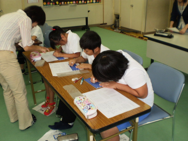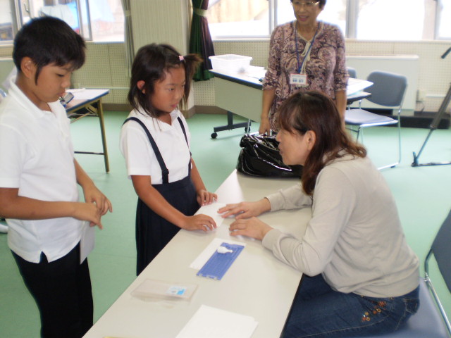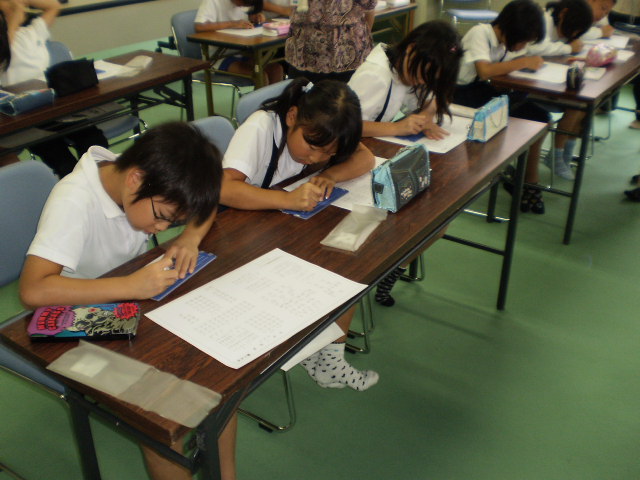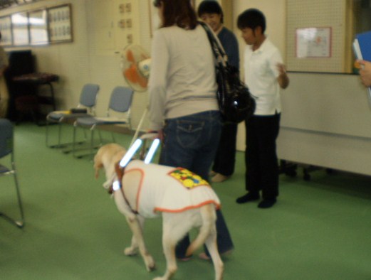 3・4年生が目の見えない人への理解(点字)を深めるために、総合的な時間を使って点字の学習をしました。講師の宮本さんが、盲導犬クレルを連れて入って来られると、初めて見る盲導犬の賢さに驚いていました。点字ボランティア「アイパル」の方々3人と共に、点字の読み方書き方を習いました。点時機を使って自分の名前を打てる様になり、嬉しそうでした。目の見えない人に対して理解が深められました。