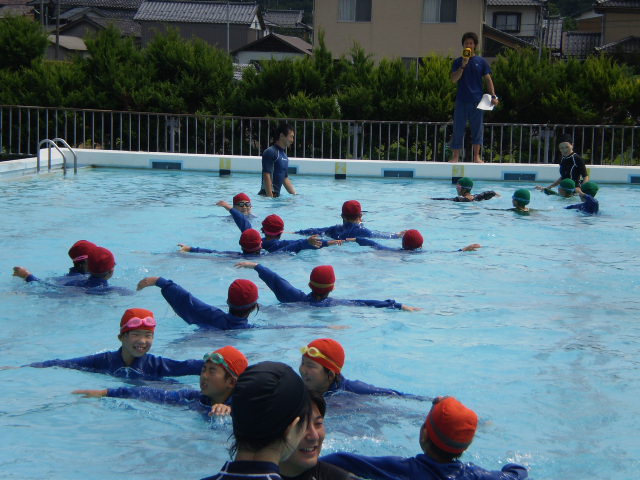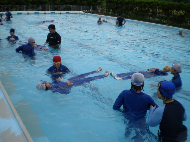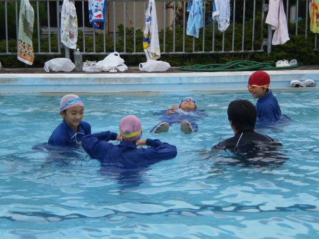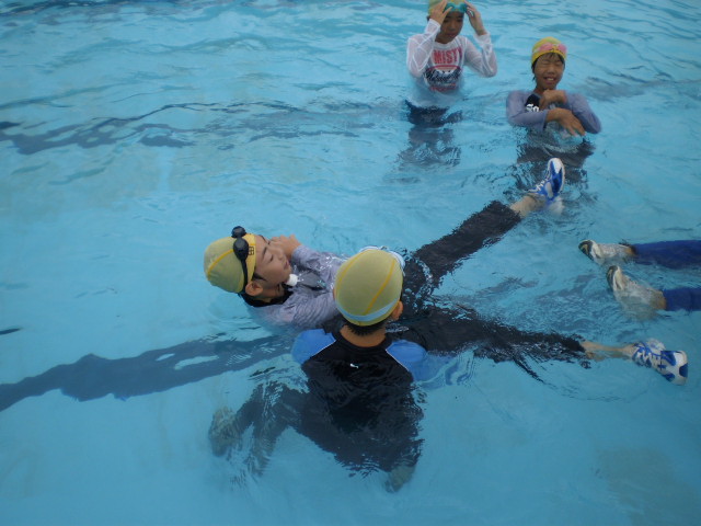 海や川でおぼれた時には服を着ています。濡れて重くなった服や靴を身につけていても、水に浮き助けを求めることができるように、着衣泳を指導してもらいました。消防隊員7人の方々がやさしく教えてくださいました。横歩きやたて歩きをしたりペットボトルをつかんで浮いたり・・・溺れそうになったら、あわてず、身近なものにつかまって体を浮かせ、助けを呼ぶことが大事です。