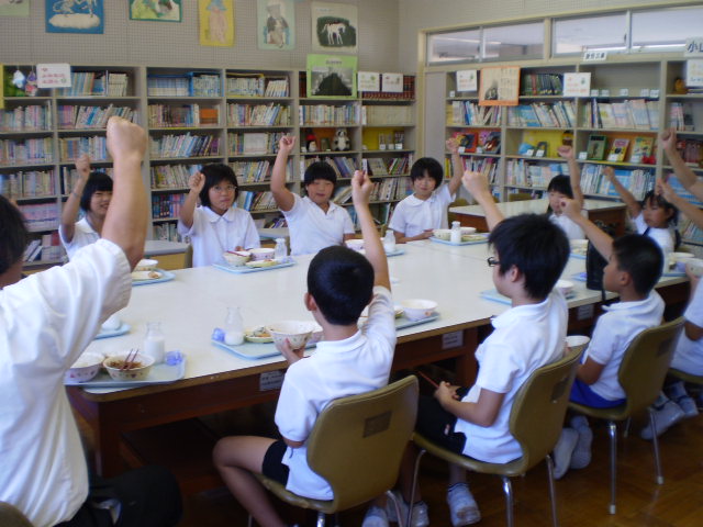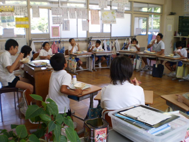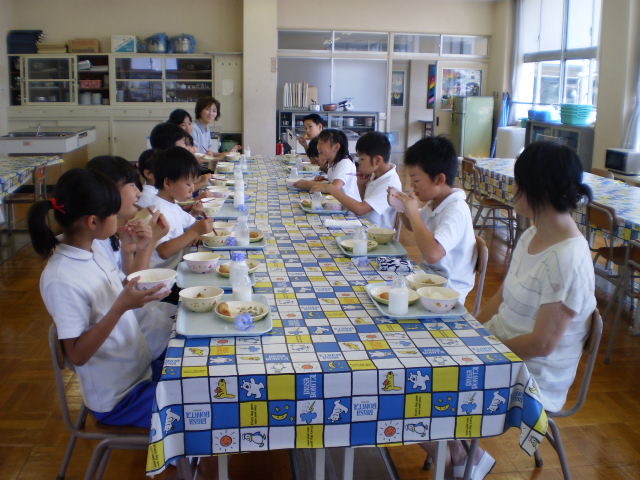 運動会に向けて、4つの縦割り班が決定しました。今日は、班ごとに同じ部屋に集まり一緒に給食を食べ絆を深めました。6年生を中心に、12~13人の児童と2人の先生で構成されます。給食を食べた後、早速、運動場に出て走るタイムを計測するグループも見られました。