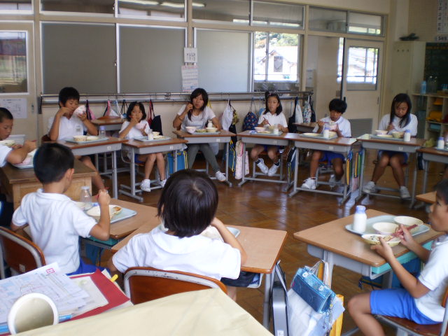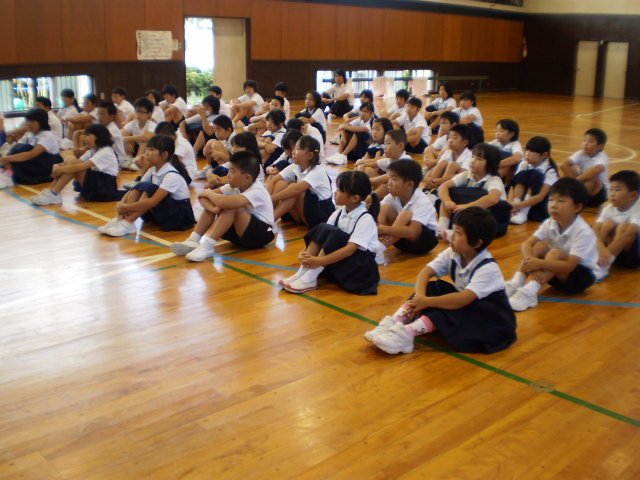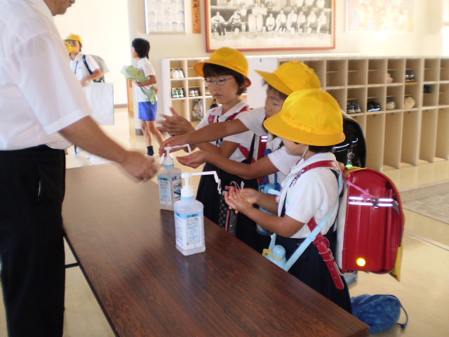 今日から2学期が始まりました。一段とたくましく日焼けした顔は、楽しかった夏休みの思い出を、物語っているようでした。全国的に感染拡大が心配される新型インフルエンザ対策の一つとして、今日から、登校直後に玄関で手を消毒することになりました。教育委員会から消毒液が配布されました。