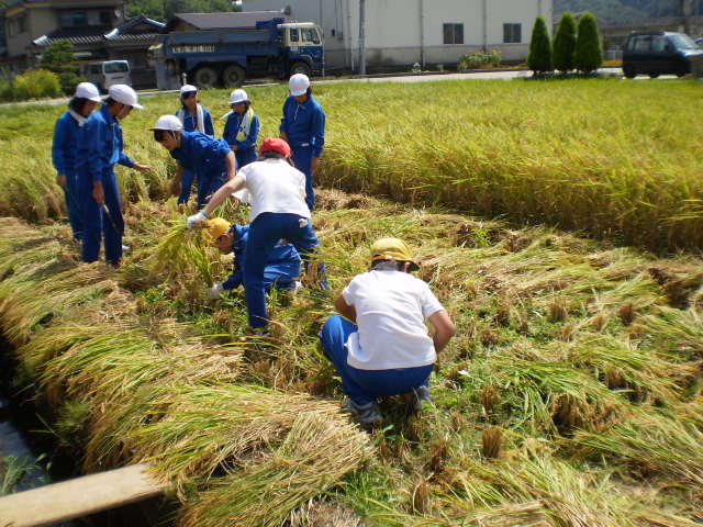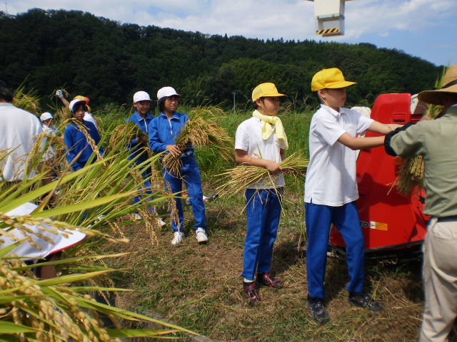 今日は、4・5・6年登校日でした。プールに入った後、10時から稲刈りをしました。三木町の堀田さんから、刈り方を教えてもらい、4・5年児童は、意欲的に稲を刈っていました。今年は天候不順で生育が心配されましたが、堀田さんは、「子供たちが手植えした稲が、機械植えよりも早く生育した。」とおっしゃっていました。刈った稲は、すぐに堀田さんのコンバインで脱穀しました。