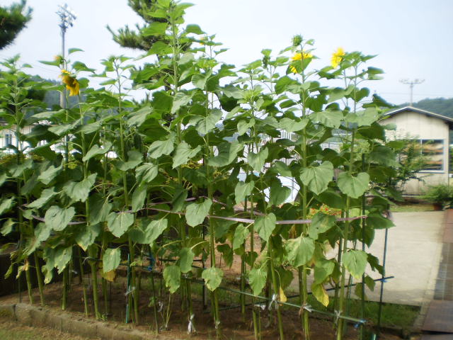1年生が、春に種をまいたヒマワリが、今では、2メートル以上に育っています。