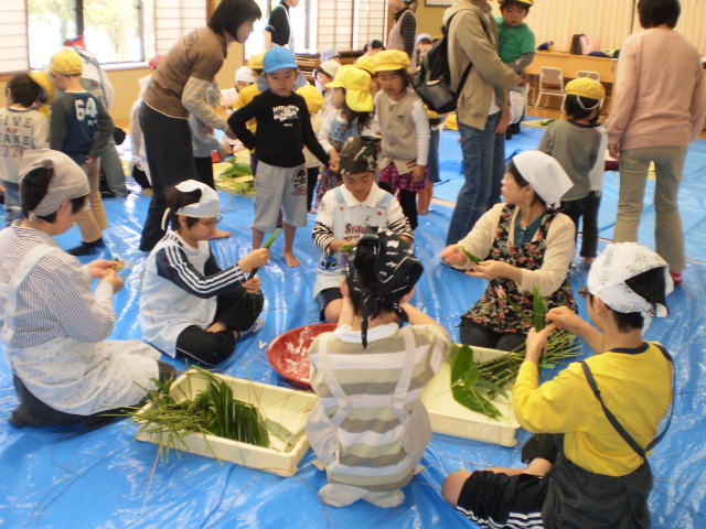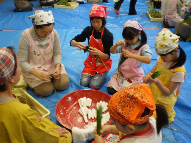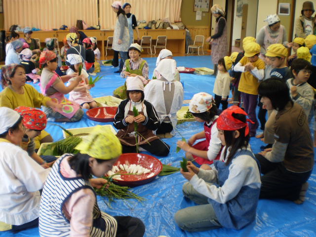 地区のおばあちゃんやお母さん方から、笹の巻き方、しばり方を教わり一生懸命、包んでいました。こうした古くからの伝統を受け継いで行くことは、大変良い体験だと思います。