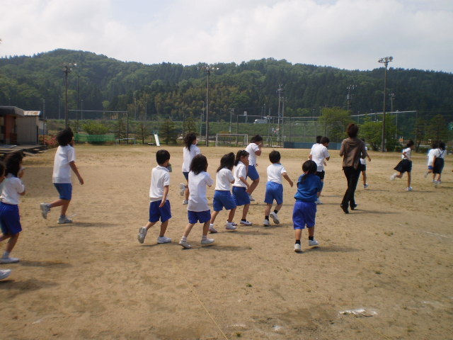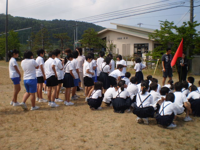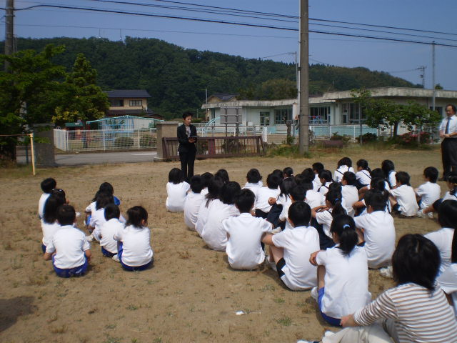 を合言葉に、全校児童が速やかに運動場へ避難しました。かかった時間は1分44秒。口に、ハンカチを当てて決められた経路を通って静かにできました。