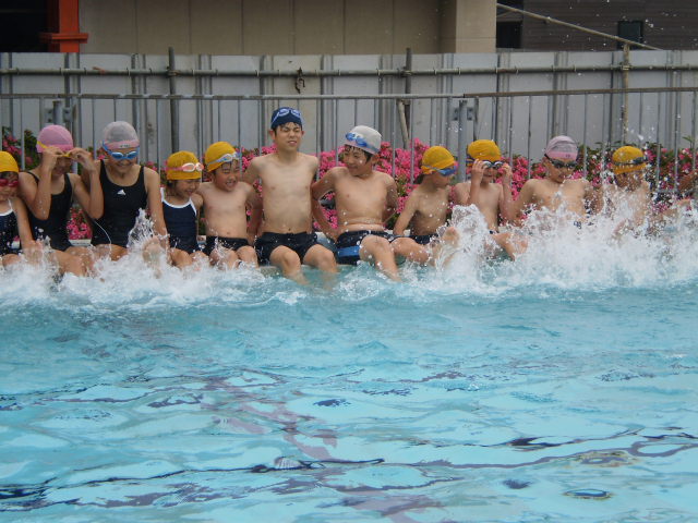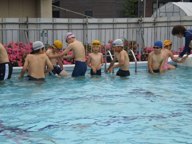 今日は、気温、水温ともに25度になりました。1年生にとっては、学校の深いプールは初体験なので、6年生とペアになって、入りました。おかげで、怖がる子は一人もいなくて、みんな楽しそうに水遊びを楽しんでいました。
