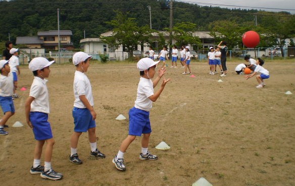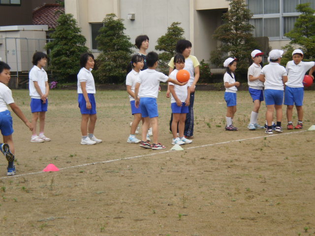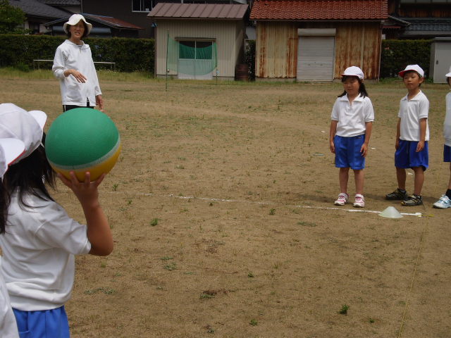1年生、5メートル届くかな? 2年生は、バウンドなしで投げよう