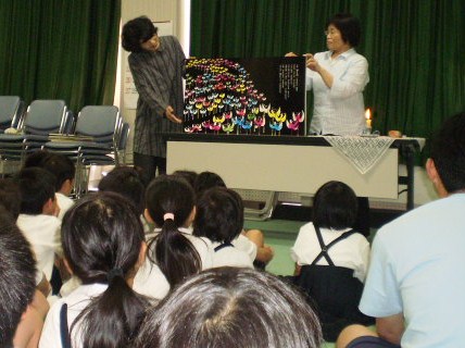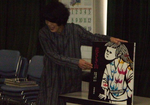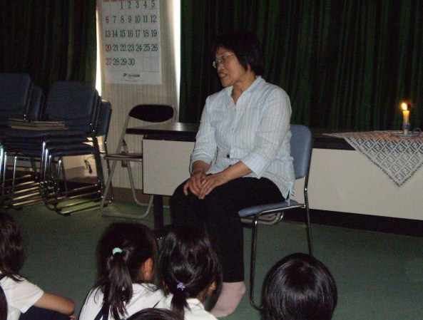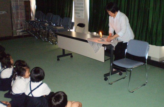 「山中お話の会」の方を招きました。暗い部屋に「お話のろうそく」をともして、まず、福島弁で昔話を聞きました。「くさかった」「つるかめ」「猫の名前」の3つです。絵がないお話は、ゆっくりと語りかけ、各自が想像力を働かせ、絵本にはない良さを感じました。斎藤隆介さんの「花さき山」の大型絵本は、きり絵が大変美しく迫力満点でした。優しいことを一つすると、その子の花が一つ咲くという話に、みんなうっとりと聞き入り、優しいことして自分の花を咲かせたくなりました。