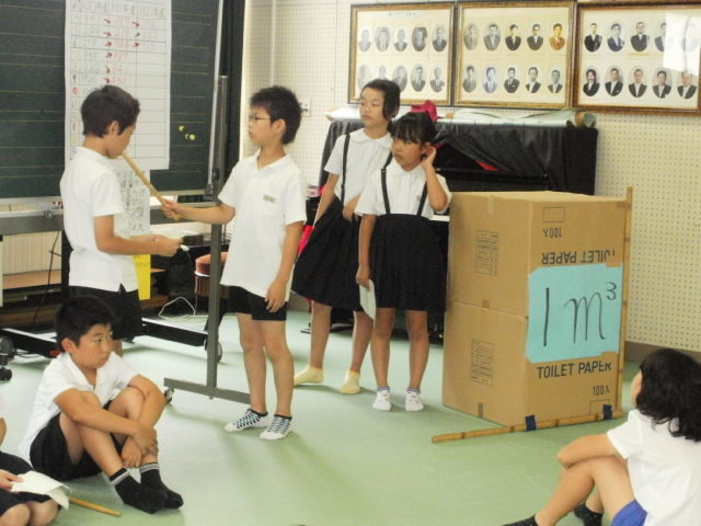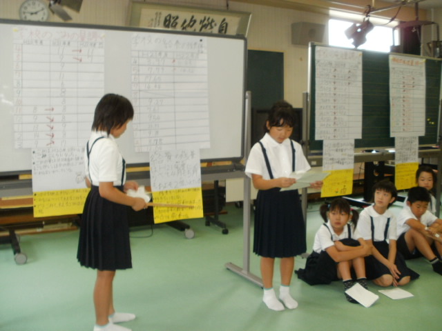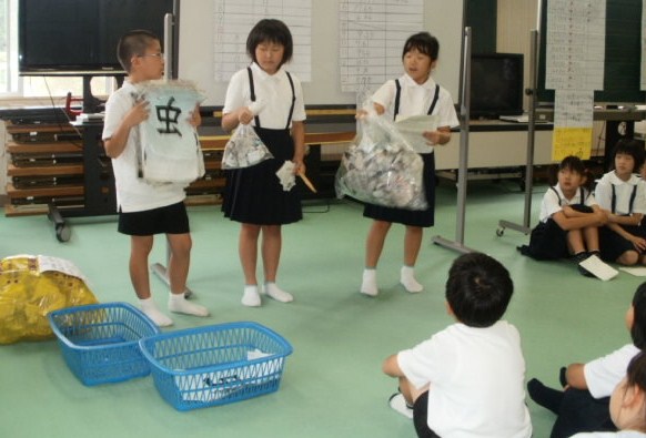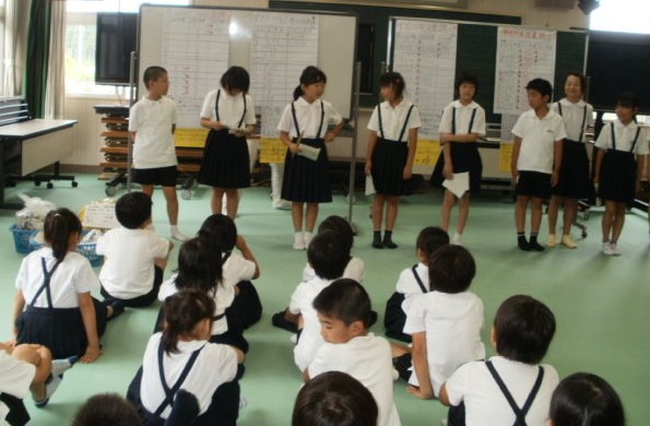 学校の、電気料、水道量、ごみの量、給食の残量の4つについて、過去3年のデーターをまとめてくれました。多くなった原因や、減らすための対策について上手に全校児童に発表しました。みんなは、これから、地球のためにできることから、気をつけようと誓いました。