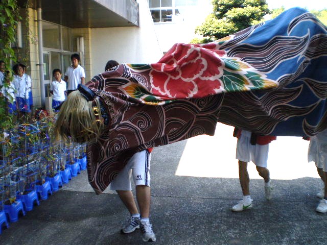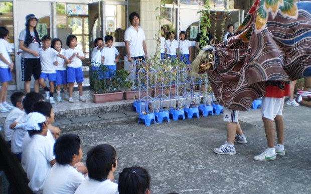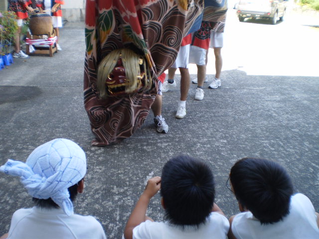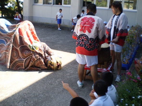 昼休みに、熊坂町の獅子舞が来ました。迫力ある獅子の動きに、低学年の子は、怖がって逃げたり泣いたりする子もいました。中に入っているのがお父さんだとわかると少しほっとした表情でした。最後に獅子に顔をかんでもらいました。