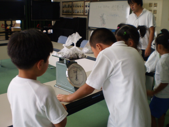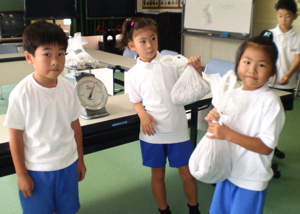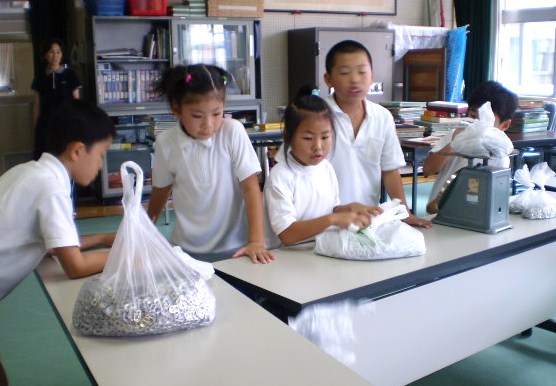 水曜日に児童会が、プルタブ回収を行っています。今日も、袋いっぱいのプルタブを持ってきてくれた子がたくさんいました。一人で、2kgも持ってくる子もいます。到底、家庭だけでは集められる量ではありません。きっとご家族の皆さんが知り合いの方などに呼びかけて、せっせと集められたのだろうと思います。「これで、だいぶん集まったし、車いすが買えるかも。」と嬉しそうにつぶやきながら、はかりで重さを計測し記録していました。