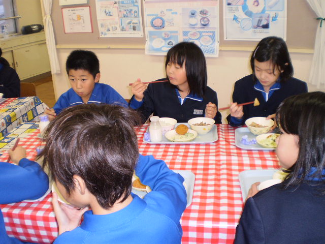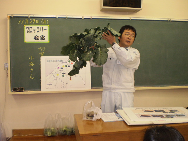 加賀市の野菜生産について理解を深めてもらおうと、今が旬のブロッコリーについてお話をしてもらいました。全校で家庭室に集まり、メニューにあるブロッコリーサラダを食べながら、kが農林事務所のKさんに話をしてもらいました。