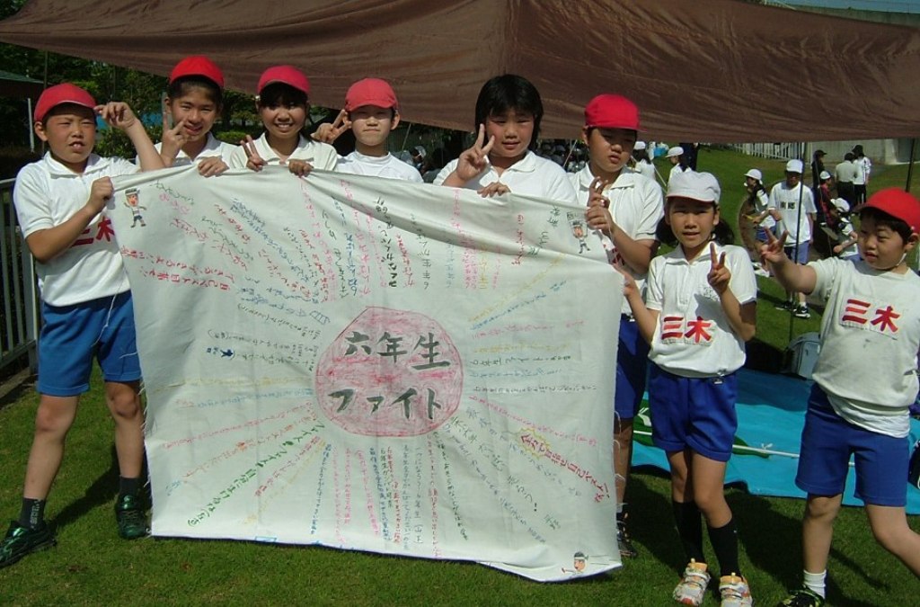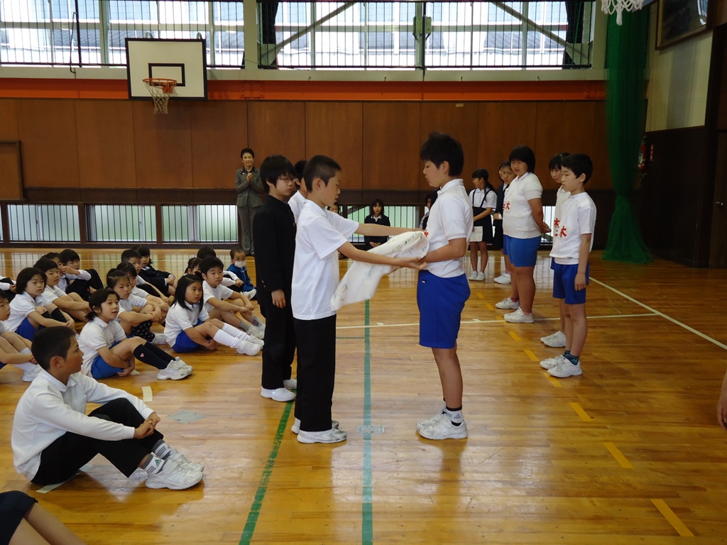 明日は、加賀市連合運動会です。市内21校の6年生674名が加賀市陸上競技場に集まり競技をしたり交流を深めたりします。6年生は、この日のために体育授業や放課後、運動場で練習してきました。5年生を中心に、激励の応援旗の作成やメッセージを送りました。