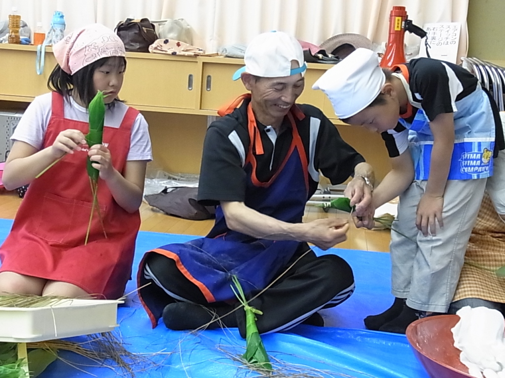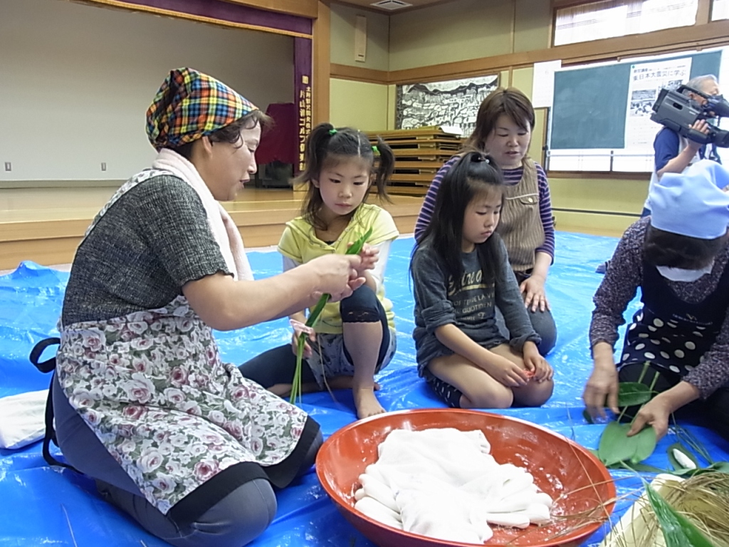 地域の方と児童が一緒に作りました。お菓子屋さんで売っている「ちまき」は食べたことがありますが、実際に自分で作るとなるとなかなか難しかったようです。