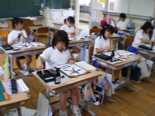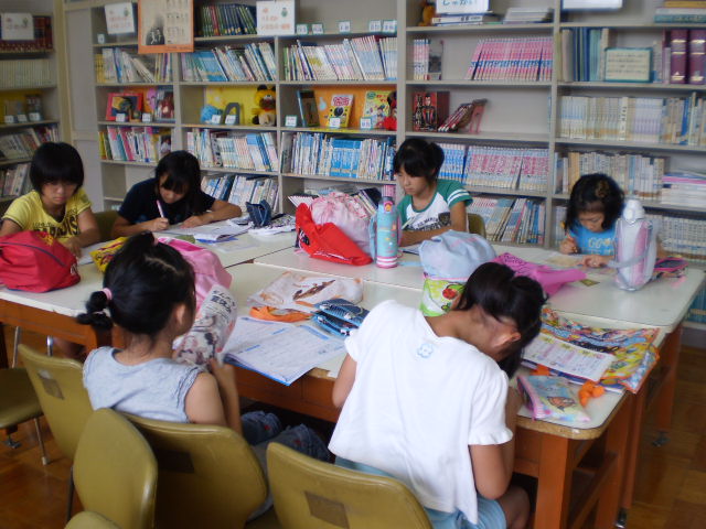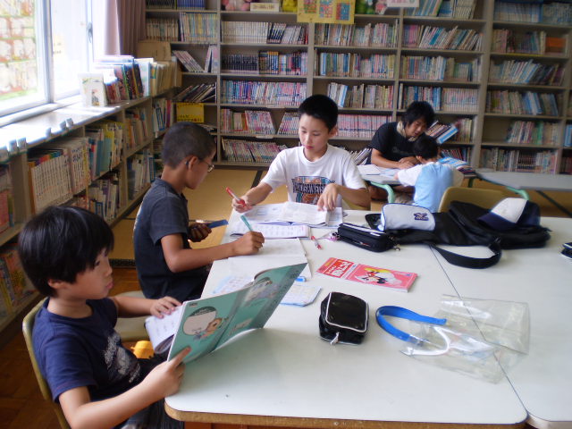 夏休みの宿題を、クーラーのきいた図書室で友達と一緒に勉強しようと兄弟そろって参加している子もいました。わからないところは、先生に聞く子もいますが、ほとんどの子は、静かに黙々とドリルを仕上げていました。