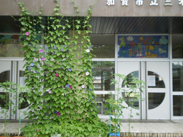 玄関前に1年生が、朝顔とケナフを植えて育てています。