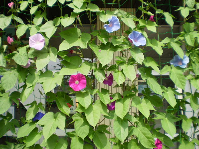 赤や青のおおきな朝顔が、毎朝咲き涼しげに出迎えてくれます。