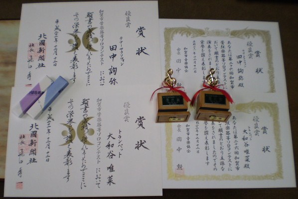 12日(土)、加賀市文化会館で、ソロコンテストがありました。予選を勝ち抜いてきた児童生徒が本選会に挑戦しました。小学生の部は9名出場しました。当時は、先生方と一緒に応援に行きました。三木小学校の2名は、金曜日のリハーサルより、本番は緊張して十分力を発揮できなかったのが少し残念でした。しかし、二人とも優良賞の賞状とトロフィーを貰って来ました。今朝、校長室で田畑さん、6年担任同席のもと、2人の努力を誉めました。田畑さんは、「一緒に練習の指導をさせてもらって楽しかった」とおっしゃってくださいました。熱心に毎日昼休みに指導に来てもらいました。心より感謝します。